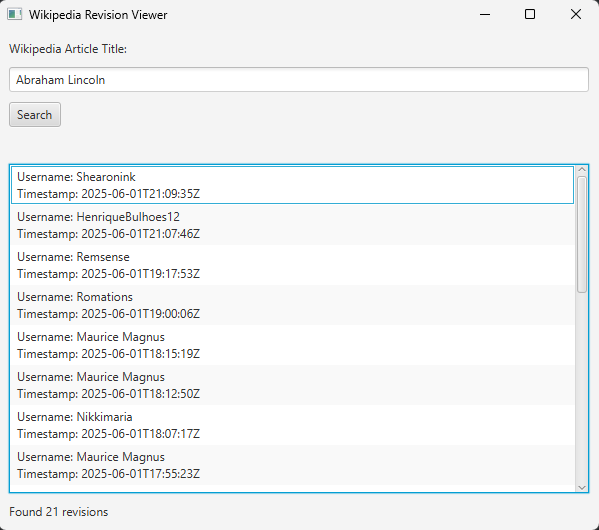 Developed a Java application that interfaces with the Wikipedia API to track real-time article revisions. Built a dual-entry system offering both a Swing-based GUI and a CLI, engineered to handle complex API redirects and asynchronous data retrieval.